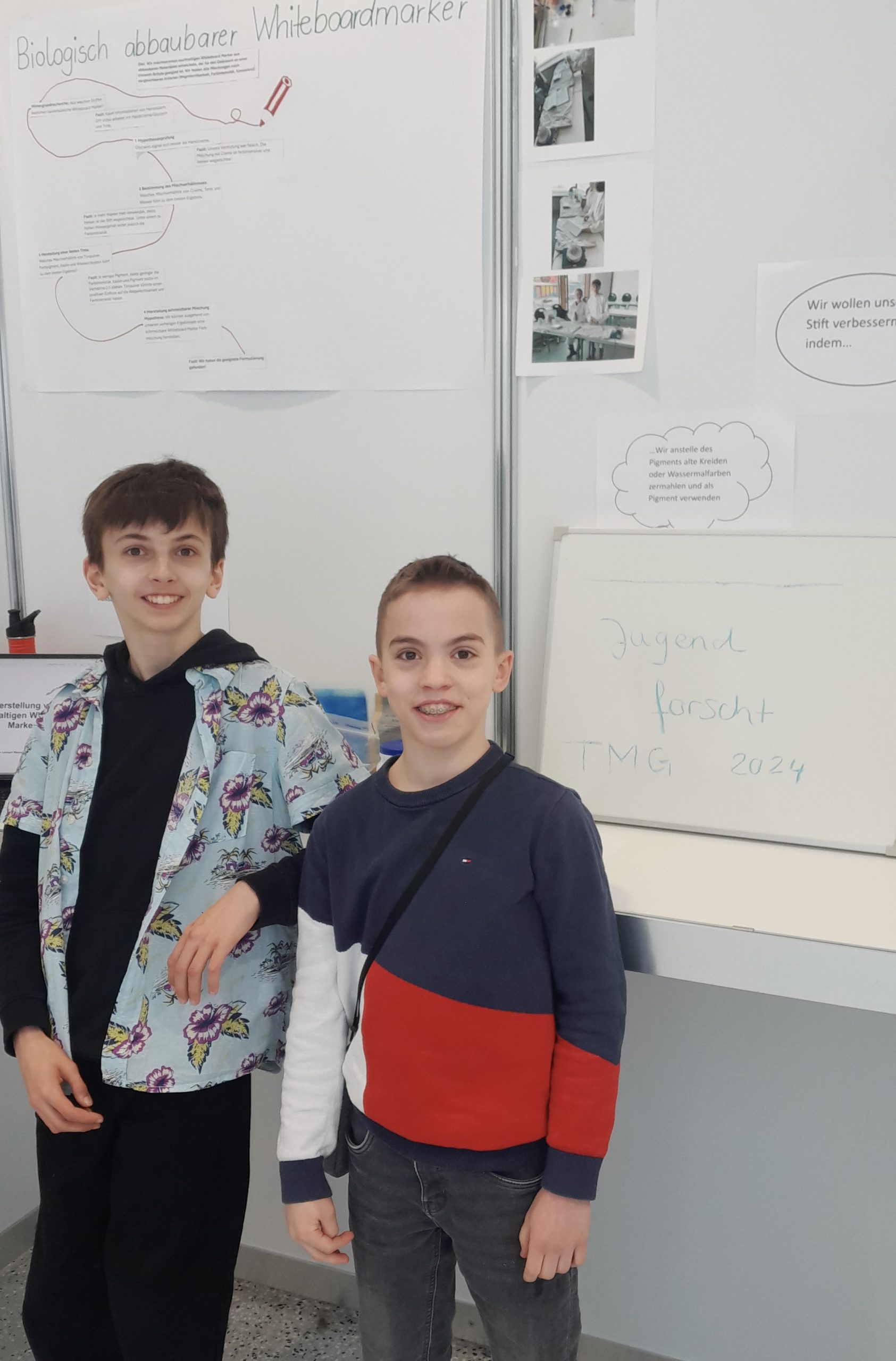Lennart und Moritz aus der 7D nahmen mit ihrem Projekt „Biologisch abbaubarer Whiteboard Marker“ bei Jugend-forscht teil. Durch intensives Forschen und anschließende Experimente konnten sie eine Tintenformel entwickeln, die auf nachhaltigen Materialien basiert. Ihr Projekt erreichte einen erfolgreichen 3. Platz beim diesjährigen „Jugend-forscht“ Wettbewerb!