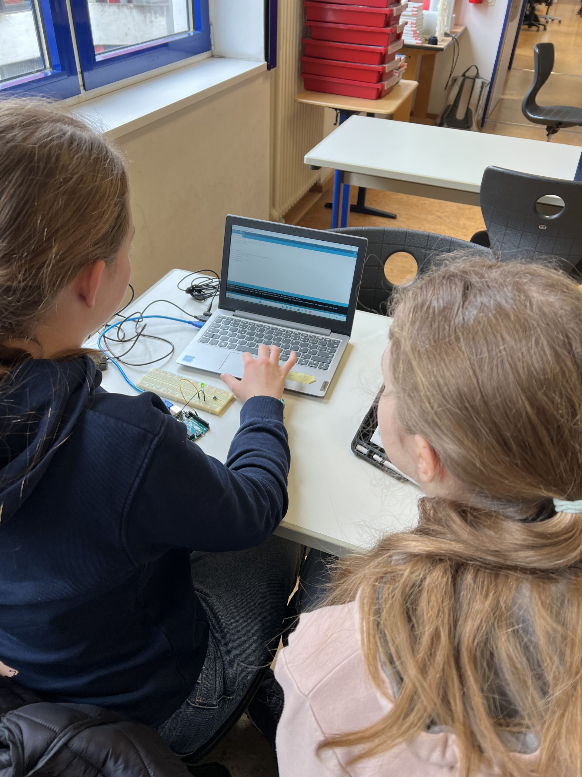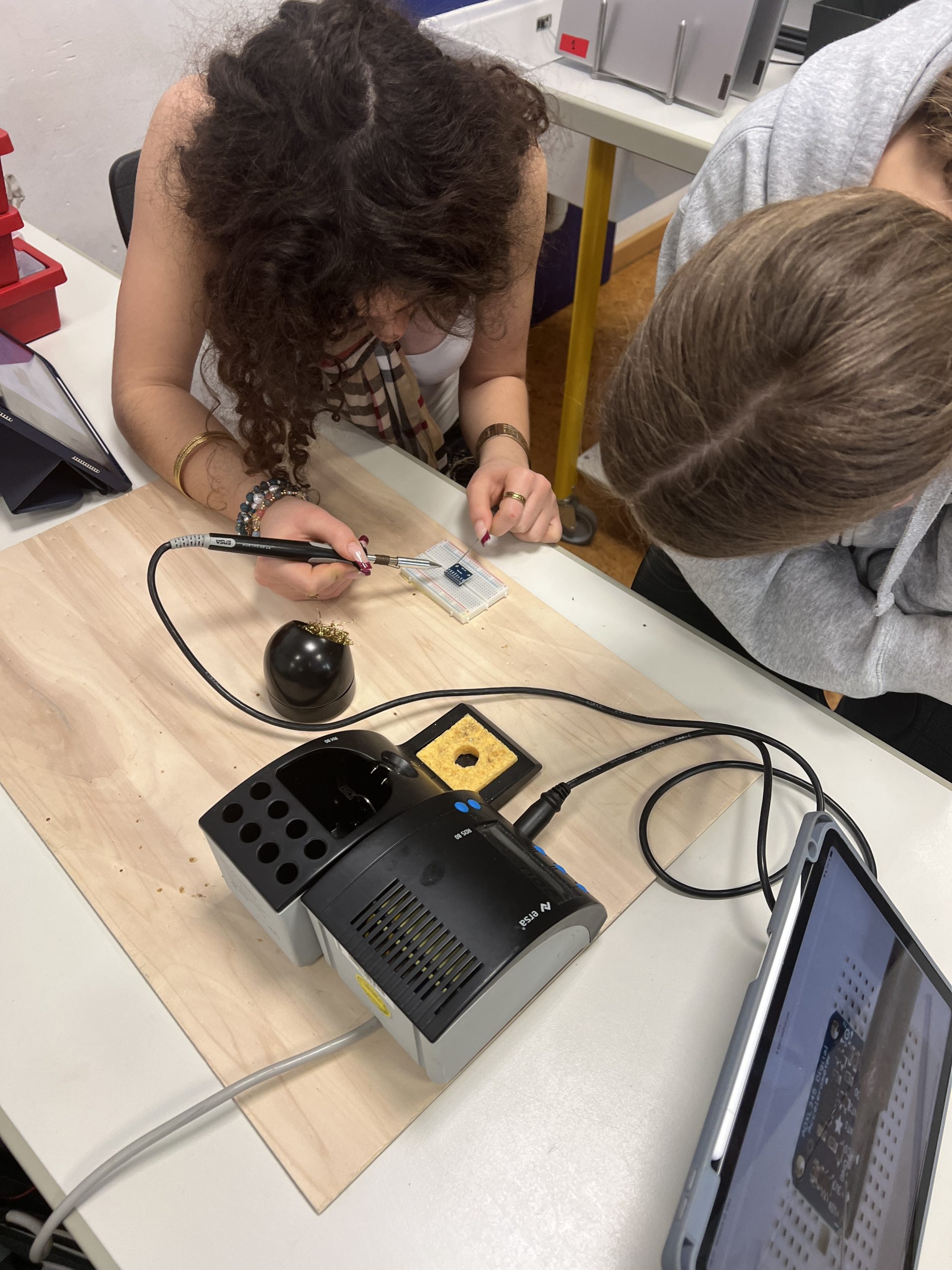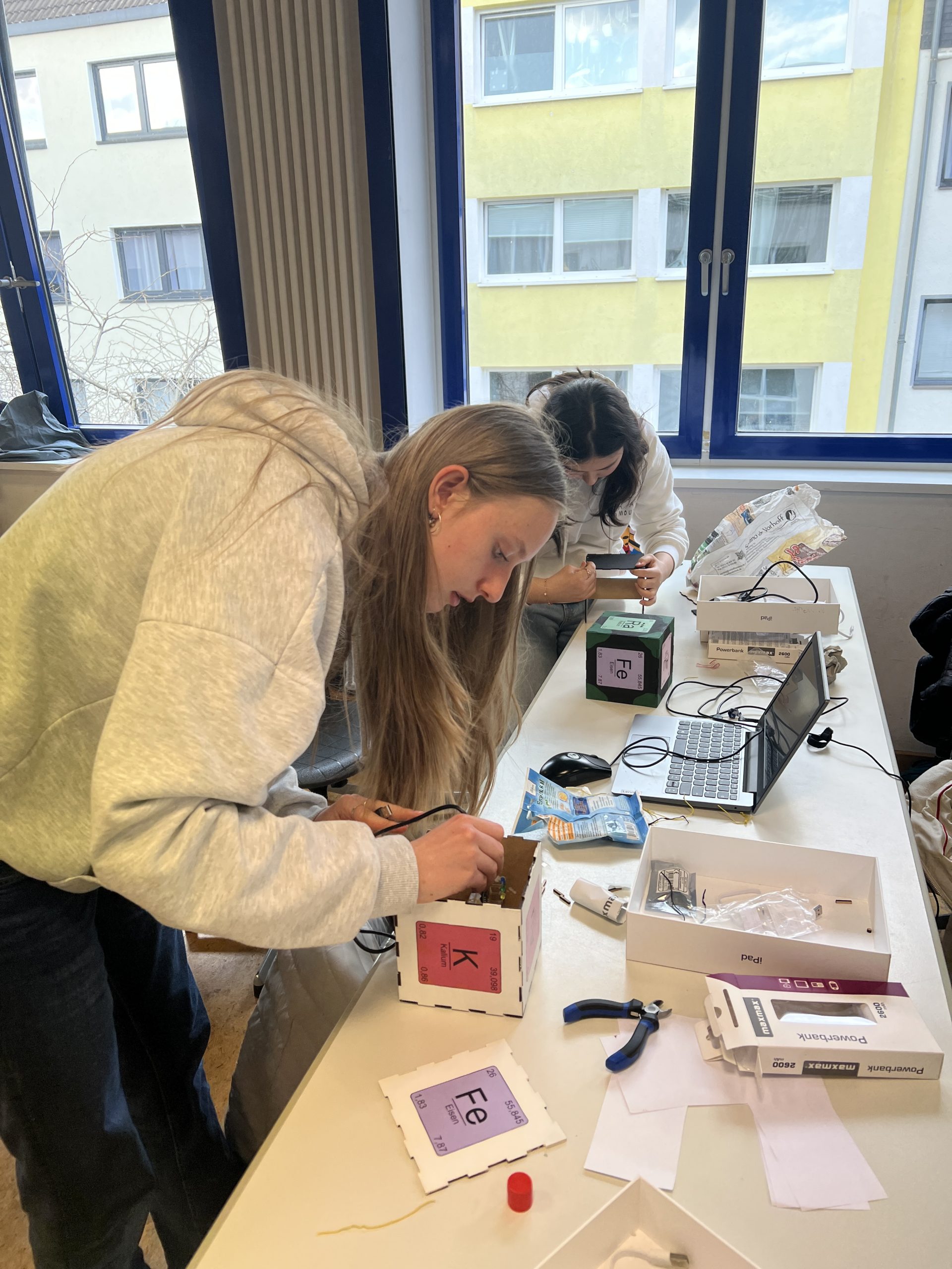 Am Dienstag gab es den Auftakt in das gemeinsame MINT-Projekt – ein MINT-Escape-Würfelautomat. Mit großem Respekt und etwas Skepsis, ob das wirklich zu schaffen ist, machten sich die zwanzig Mädchen ans Rätsel erarbeiten, Löten, Programmieren und Gestalten.