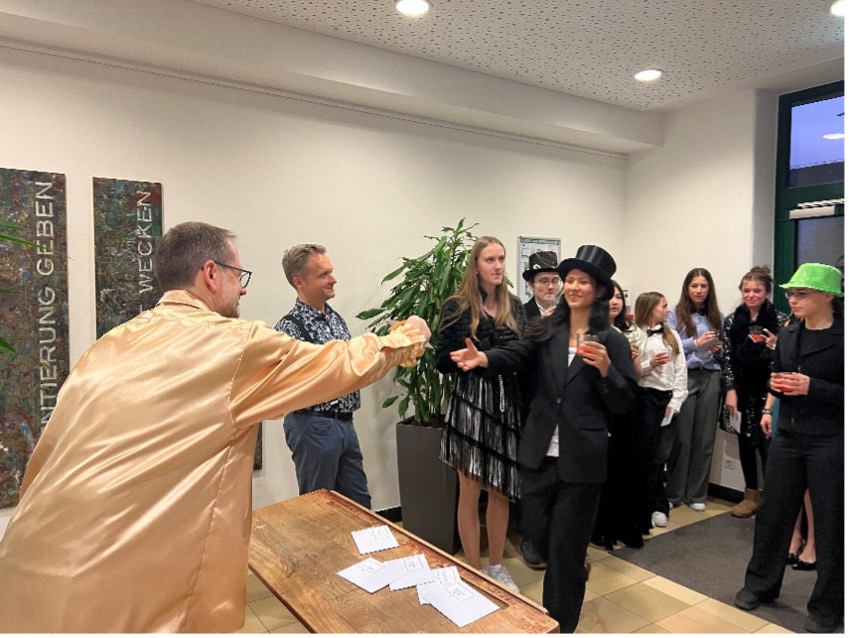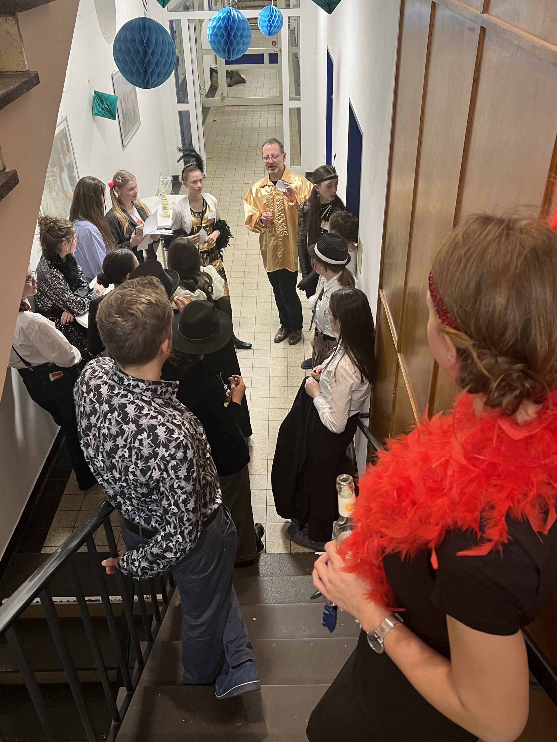 Am Donnerstag wurde weiter kräftig am Projekt gearbeitet, bevor es hieß: Auf nach Hause zum Verkleiden und Herausputzen. Am Abend wurden alle beim Krimidinner unter dem Motto „Bohème Berlin“ ins Jahr 1928 entführt und durften einen Abend im Varieté-Theater „Metropol“ genießen. Die Kostüme waren super ausgewählt und machten den Abend noch glamouröser. Auch die Lehrkräfte legten sich kräftig ins Zeug, um auch kulinarisch einiges zu bieten. Glücklicherweise konnte die Mörderin am Ende ermittelt werden und jeder am Abend beruhigt ins Bett gehen.