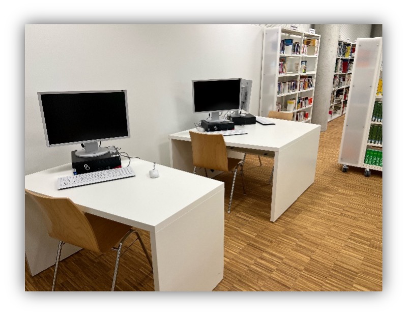 Zudem stehen sieben Computerarbeitsplätze zur Verfügung. Diese dienen jedoch ausschließlich zum Recherchieren für Referate, Facharbeiten oder sonstige Unterrichtsthemen.